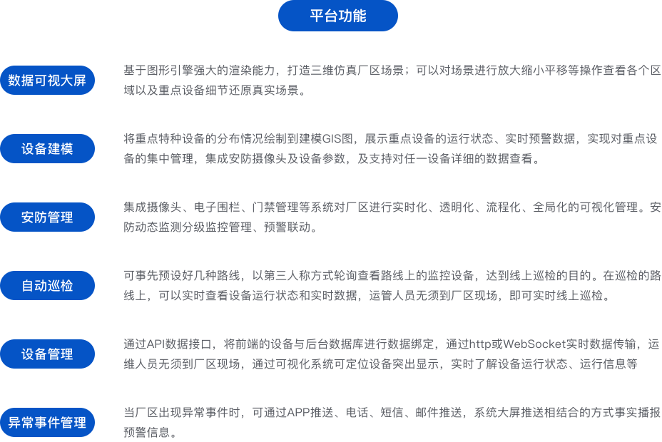三维可视化智慧管理平台可以实现安全监测系统的融合与综合展示分析。集成生产数据、监控视频及其他物联设备。实现重点设备的3D分解建模,设备工况环境模拟同步运行,各类生产数据整合及分析,预警信息及时告警。以可视化的形式直观展示厂区的安全生产状态。